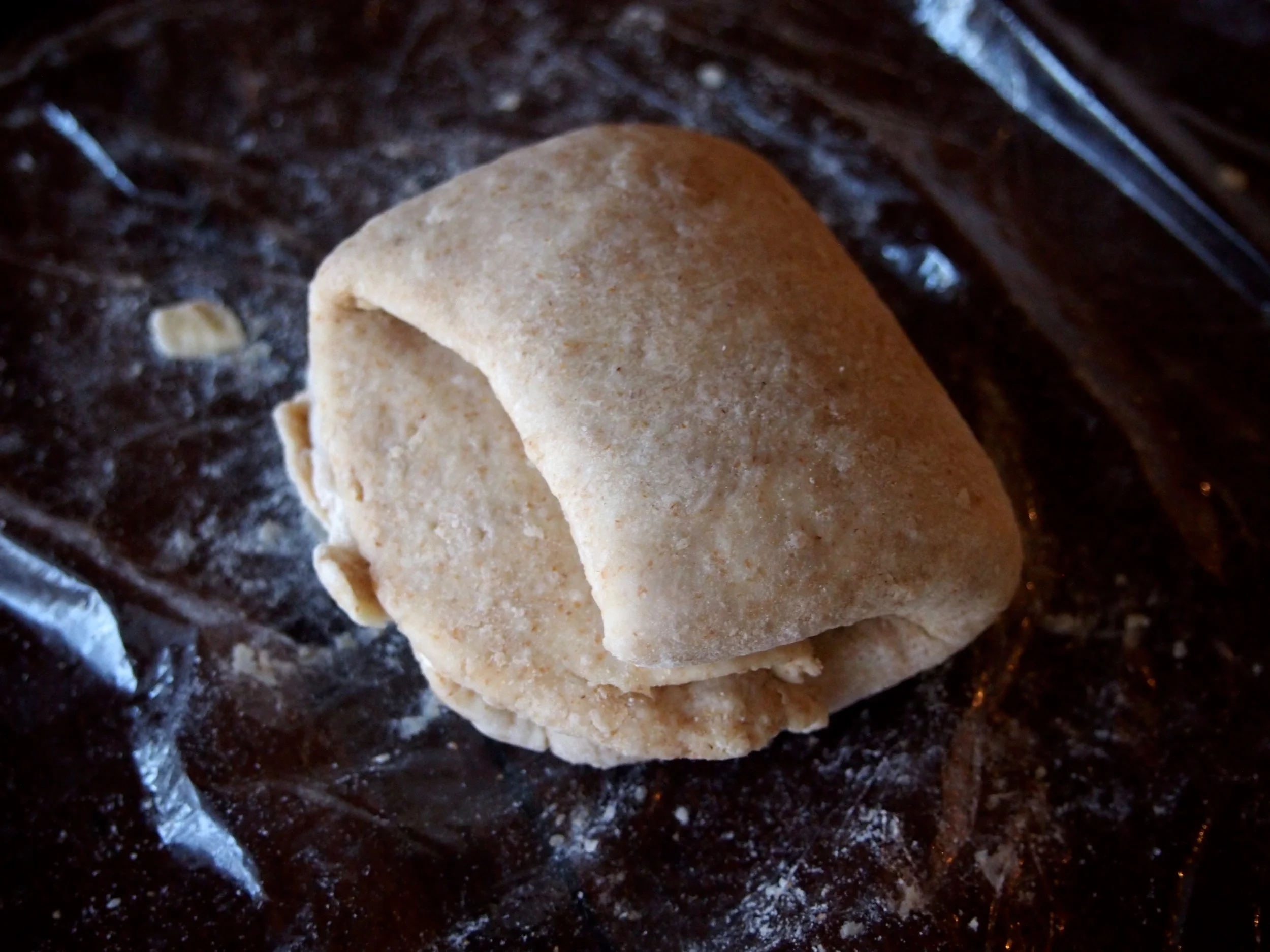 Transfer dough to a square of plastic wrap and press into a rough square, and wrap tightly. Refrigerate for about 45 minutes.